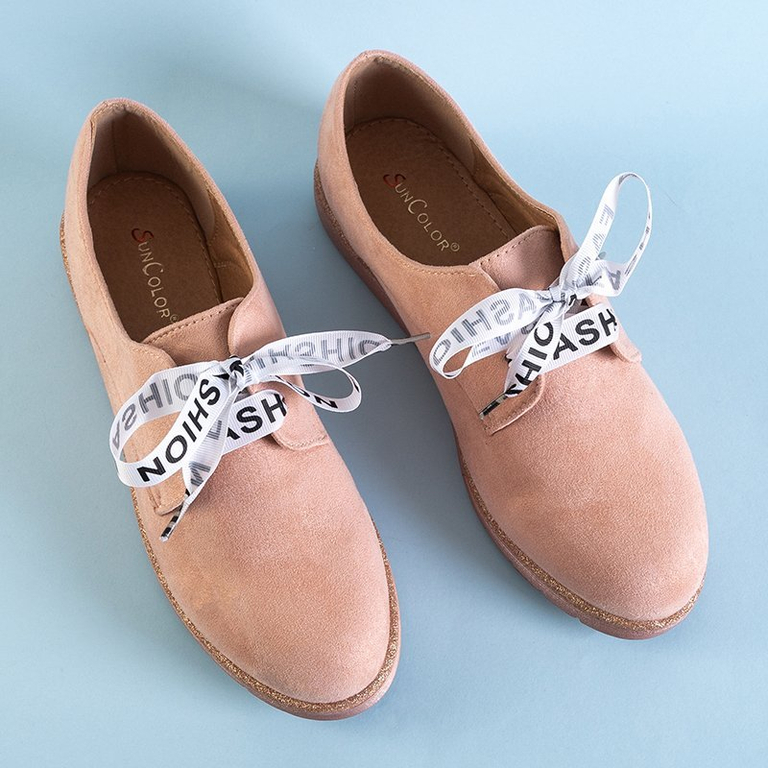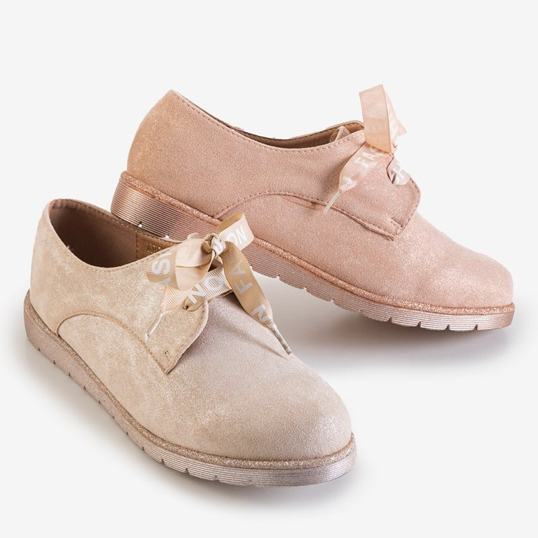 - Veľmi štýlová dámska obuv, vyrobená z ekologickej kamzíkovej kože. Model je uviazaný na stužku, vo vnútri má vložku z ekokože. Okraje podrážky sú zdobené trblietkami. Poznámka: výrobok má na materiáli stopy lepidla.