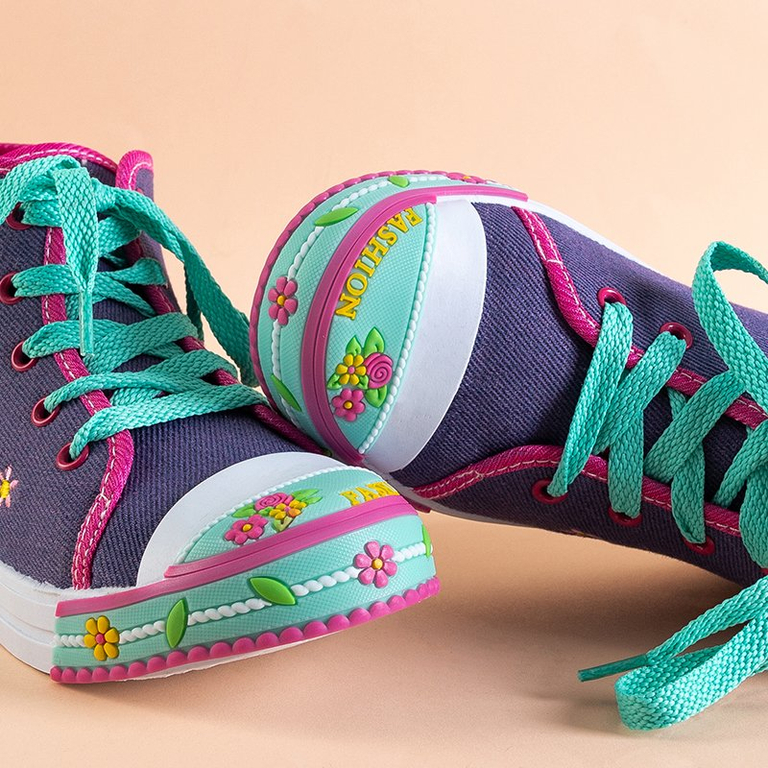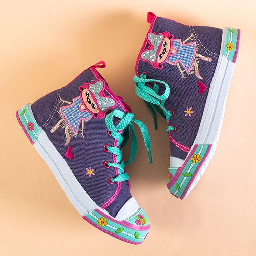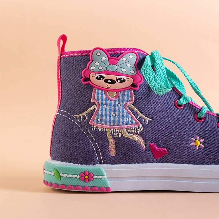- Dievčenské vysoké tenisky vyrobené z látkového materiálu a'la jeans. Šnurovací model a zips na boku. Obuv zdobia roztomilé nášivky na zvrškoch. Perfektné pre každodenné použitie!