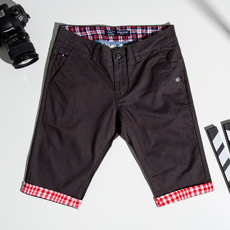 - Pánske krátke šortky po kolená, vyrobené z mäkkej bavlnenej látky. Model s nízkym pásom, vyhrnutými nohami a 4 vreckami. POZNÁMKA: Presnosť merania (+/-) 1 cm.