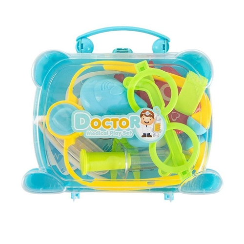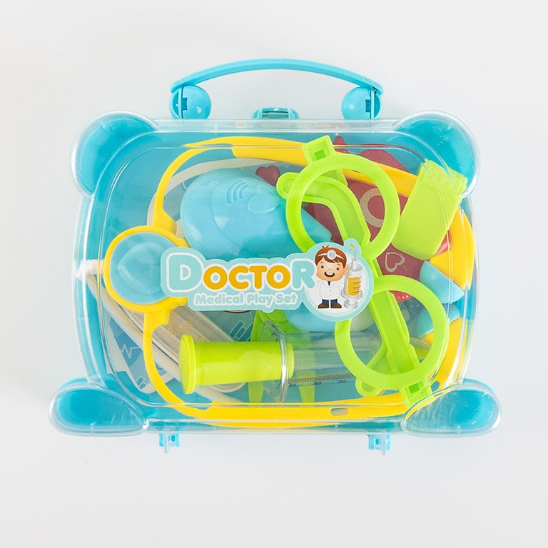 - Detská modrá lekárska súprava v kufri, vyrobená z plastu. Sada obsahuje lekárske nástroje napodobňujúce skutočné lekárske nástroje. Rozmery kufra: 18,5 x 13,5 x 5 cm.