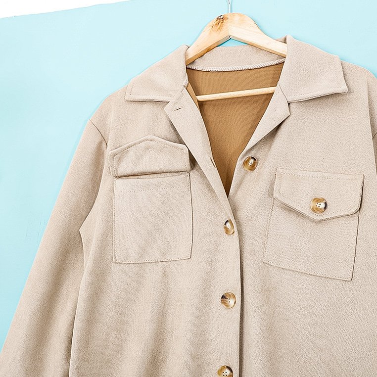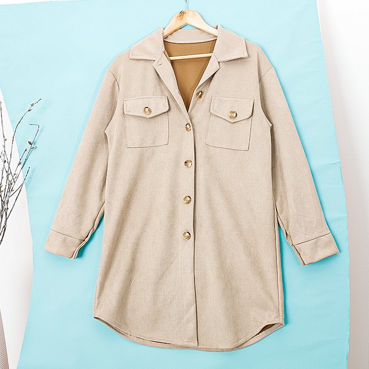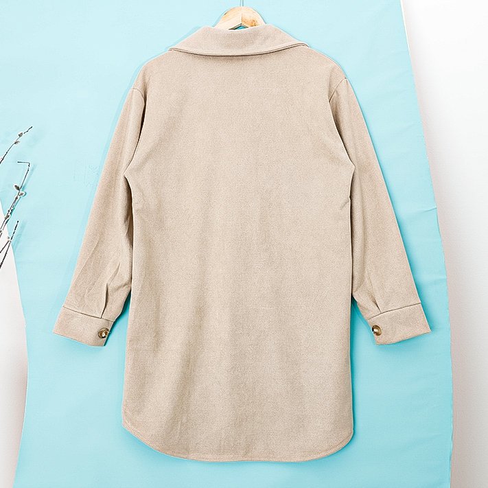 - Hit, nadrozmerná košeľová bunda, vyrobená z látky imitujúcej semiš. Model jednoduchého dlhého strihu a zapínania na gombíky. Vpredu sú dve vrecká. V ležérnych outfitoch tejto sezóny je nenahraditeľný! POZNÁMKA: Presnosť merania (+/-) 1 cm.