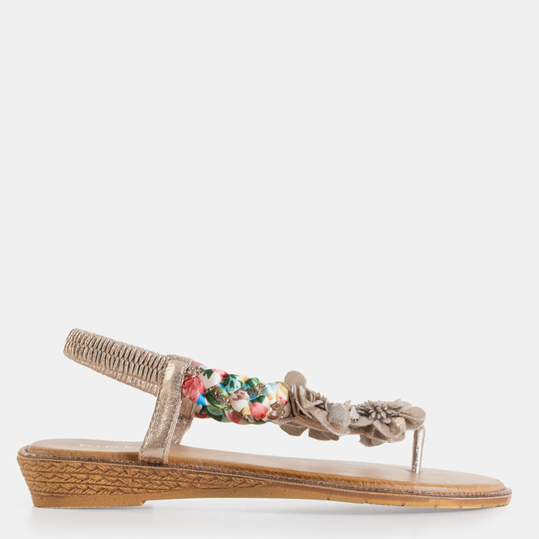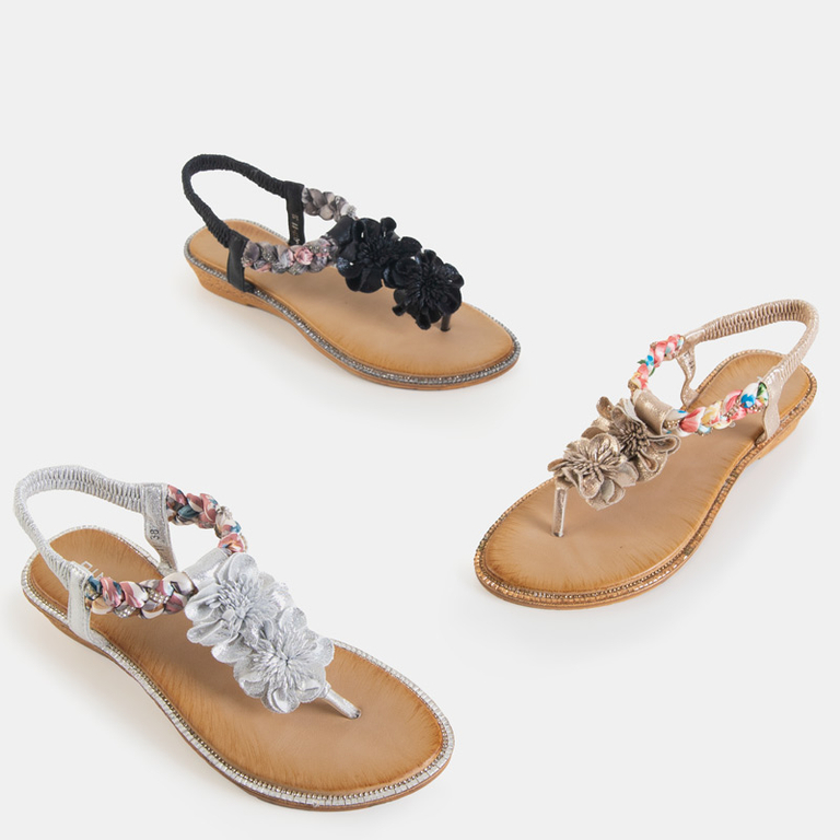 - Očarujúce dámske sandále, vyrobené z ekologickej kože. Model na nízkom klinovom podpätku, zdobený kvetmi, farebnou látkou a zirkónmi. Sandále Grassia sú skvelým doplnkom k šatám!