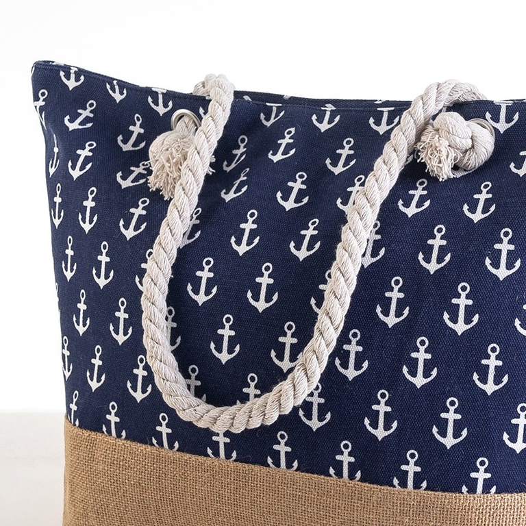 - Štýlová dámska plážová taška, vyrobená z textilného materiálu, zakončená potlačou kotvy. Model s dvoma hrubými rúčkami zo silného lana. Vo vnútri jedna priehradka bez ďalších vreciek, zapínanie na zips.