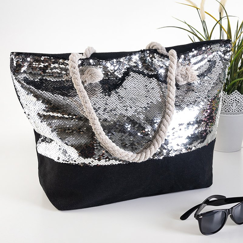 • Veľmi priestranná dámska taška vyrobená z materiálu zakončeného flitrami. Model je na zips, má 1 veľkú priehradku a 2 šnúrkové rúčky. Ideálna voľba na každodenné nosenie alebo na pláž!