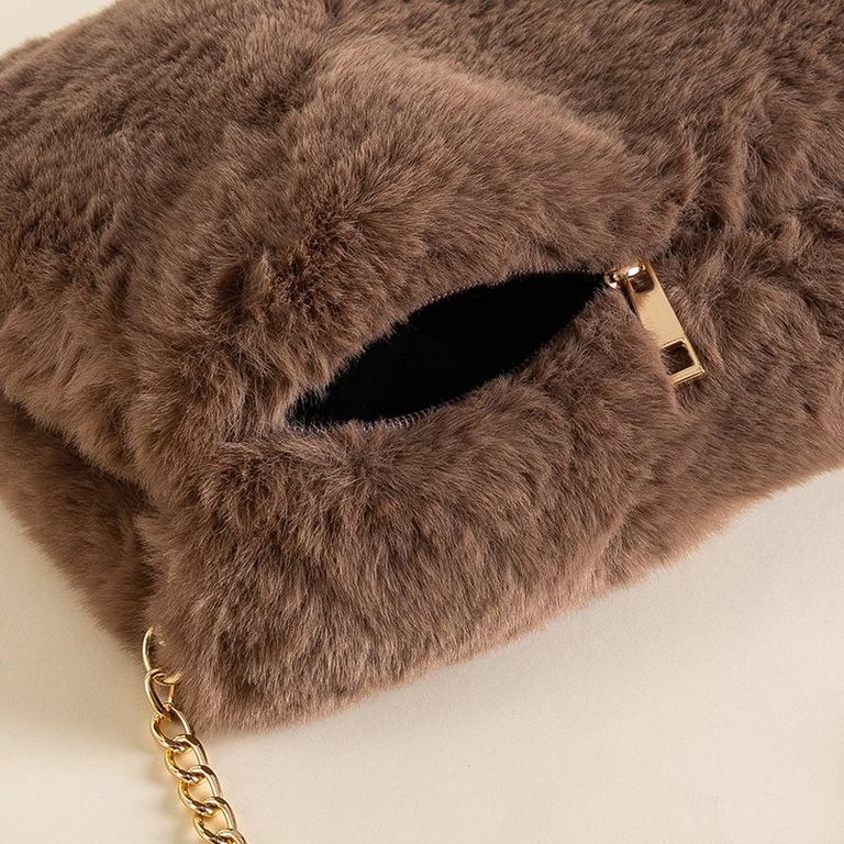 - Mäkká dámska kabelka ukončená syntetickou kožušinou a zapínaná na zips. Sada obsahuje zlatú retiazku zapínanú na homárovú sponu. Jedna priehradka vo vnútri, žiadne ďalšie vrecká. Ideálne k večerným outfitom!
