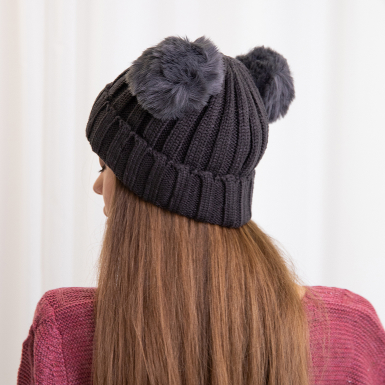 - Krásna zimná čiapka vyrobená z materiálu príjemného na dotyk. Po bokoch ozdobené dvoma nadýchanými pomponmi. Ideálne pre chladné a zimné dni!