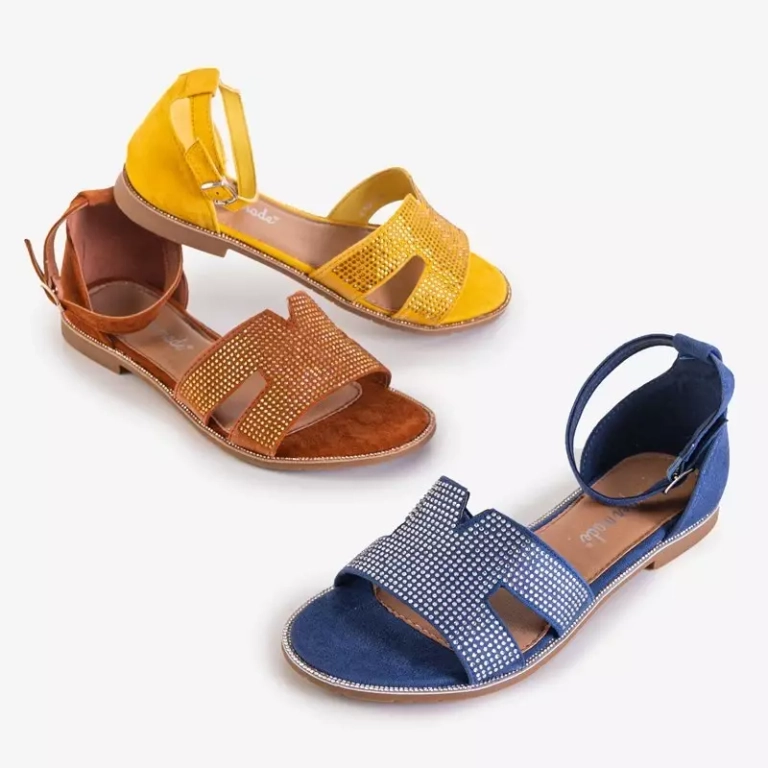 • Štýlové dámske sandále na nízkom podpätku, vyrobené z mäkkého eko semišu. Zvršok sa zapína na pracku, ozdobený zlatými zirkónmi a stielka je podšitá ekologickou kožou. Poznámka: výrobok má na materiáli škrabance.