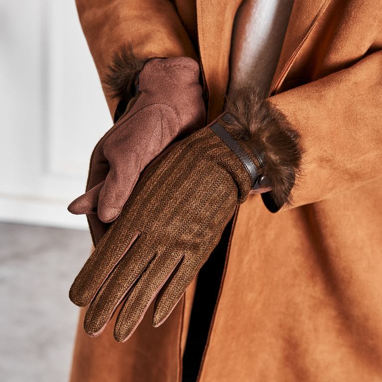 • Módne dámske rukavice z mäkkého úpletu a eko semišu. Vo vnútri jemná kožušinová podšívka. Okrem toho má model na dosah ruky prvky, ktoré vám umožňujú používať telefón bez odstránenia rukavíc.