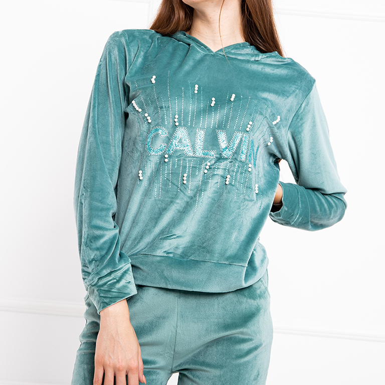 - Dámska športová súprava s nohavicami a mikinou. Model je vyrobený z velúrovej látky, ktorá je príjemná na dotyk. Vrchná časť sady s kapucňou, prevlečenou cez hlavu, nohavicami s elastickým pásom a nohami a 2 vreckami. POZNÁMKA: Presnosť merania (+/-) 1 cm