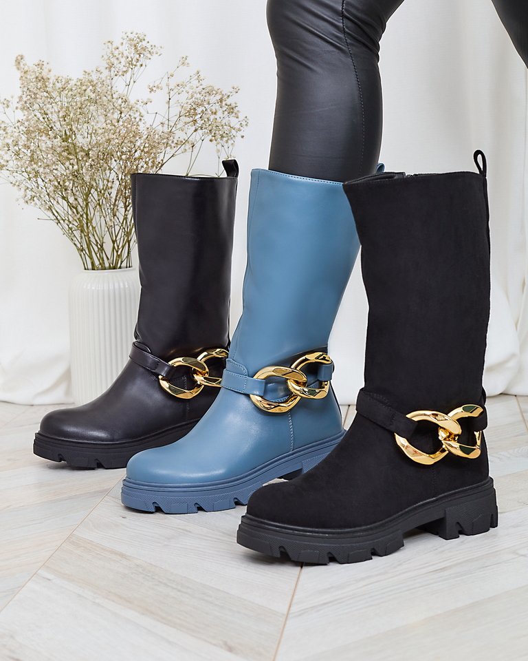 • Módne dámske čižmy nad kolená vyrobené z ekologickej kože. Vo výške členku model zdobí odnímateľný popruh s plastovou retiazkou v zlatej farbe. Topánky sa zapínajú na zips, vnútri oteplenie v podobe jemnej kožušinky.