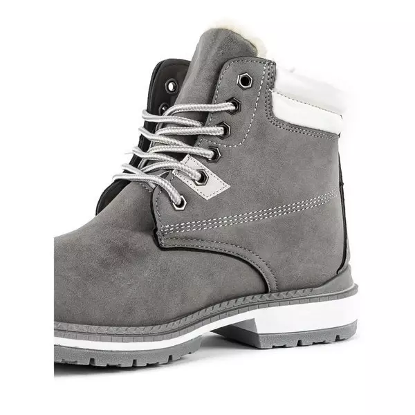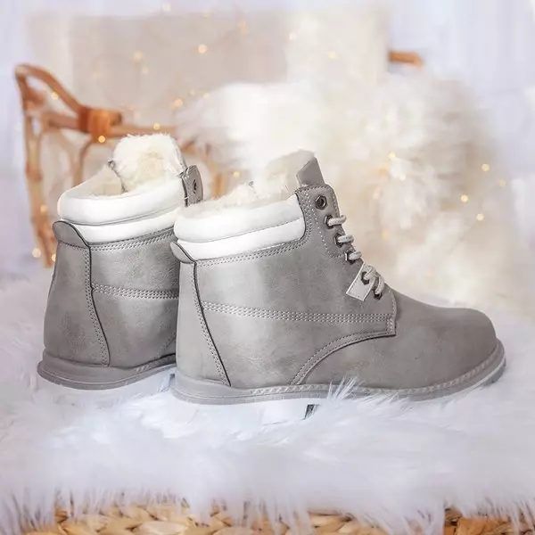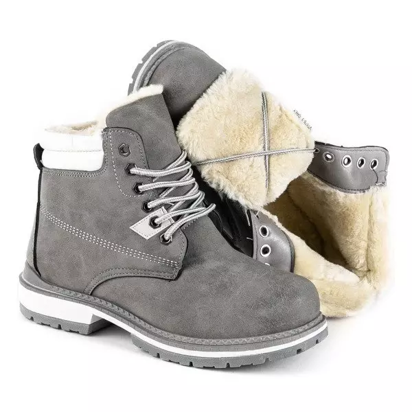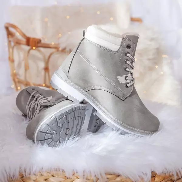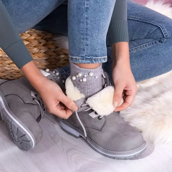 - Teplé šnurovacie čižmy s vykrojeným behúňom. Materiál je vyrobený z matnej ekokože v šedej farbe. Obuv je zateplená na dotyk príjemným kožúškom. Poznámka: Produkt má zmenu farby na materiáli.