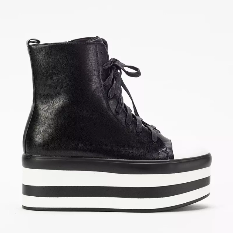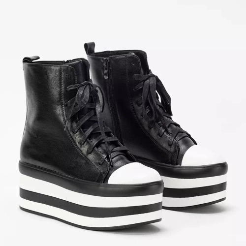 - Jedinečné dámske čižmy na vysokej platforme, vyrobené z ekologickej kože. Model je čipkovaný a má zapínanie na zips na boku, v strede látkovú vložku. Poznámka: výrobok má na materiáli stopy lepidla.