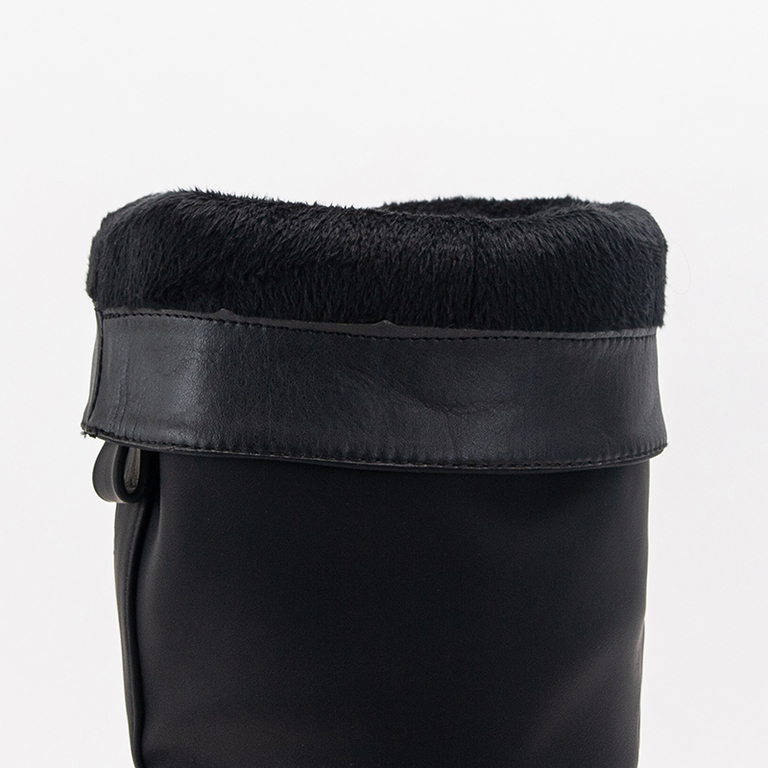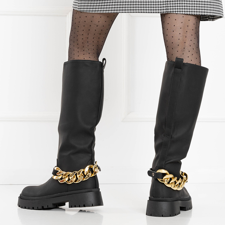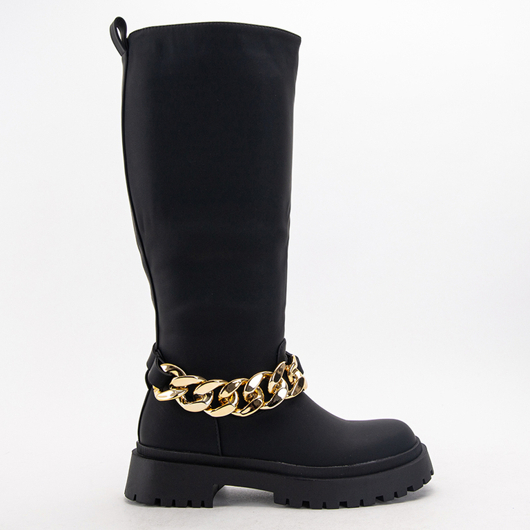 - Dámske čižmy do pol lýtok vyrobené z ekologickej kože. Nazúvacie a čiastočne zapínané na zips. Model na plochom opätku s ozdobnou hrubou retiazkou na zvršku. Má zateplenie v podobe jemnej kožušinky.