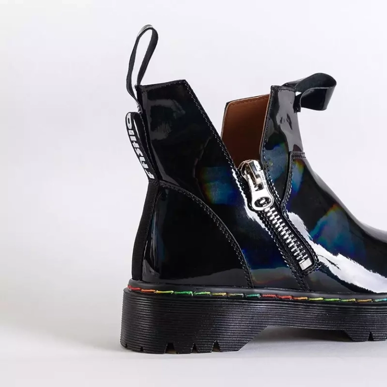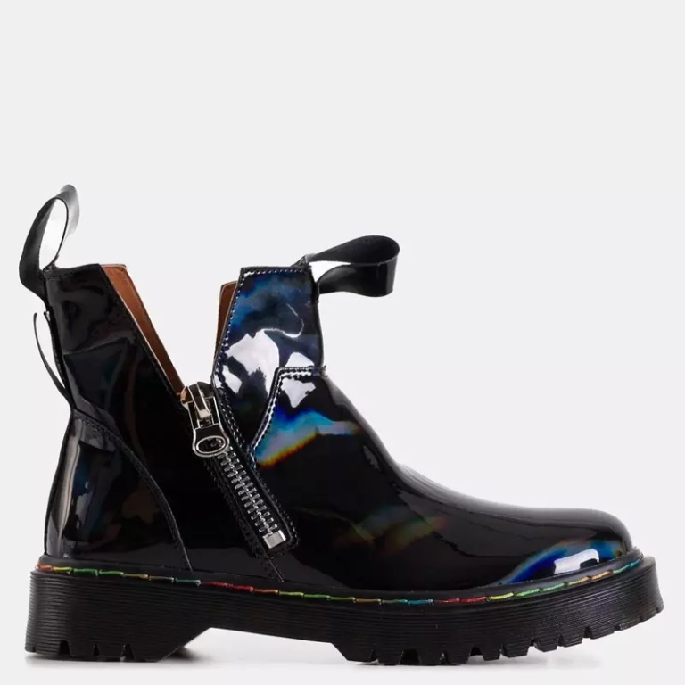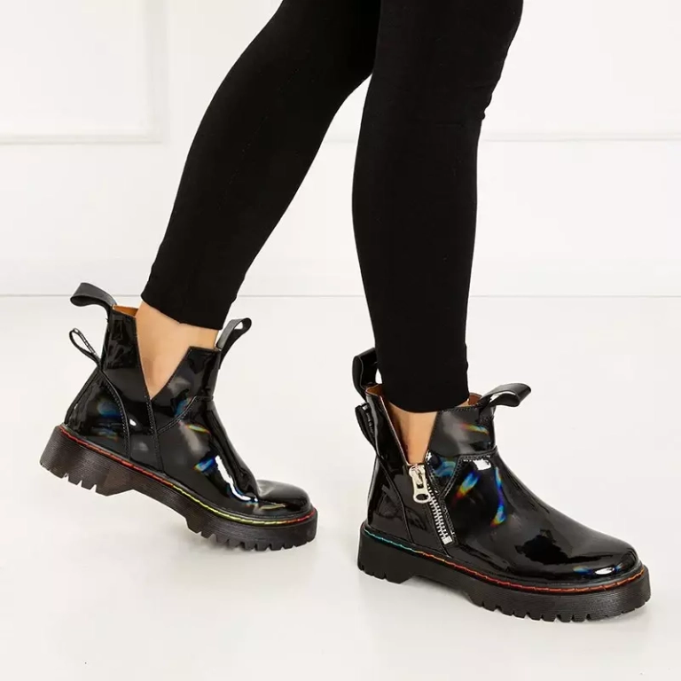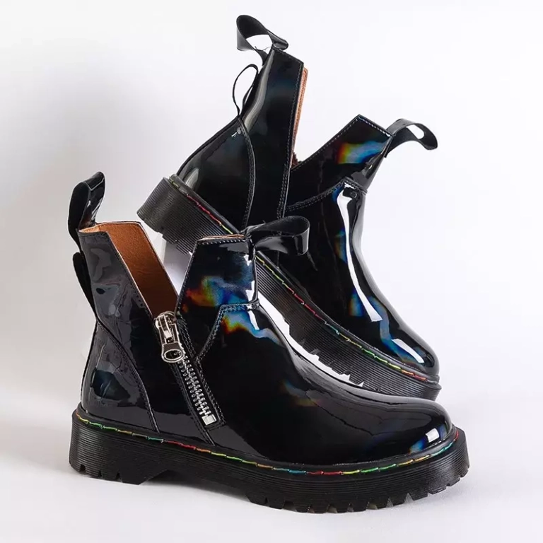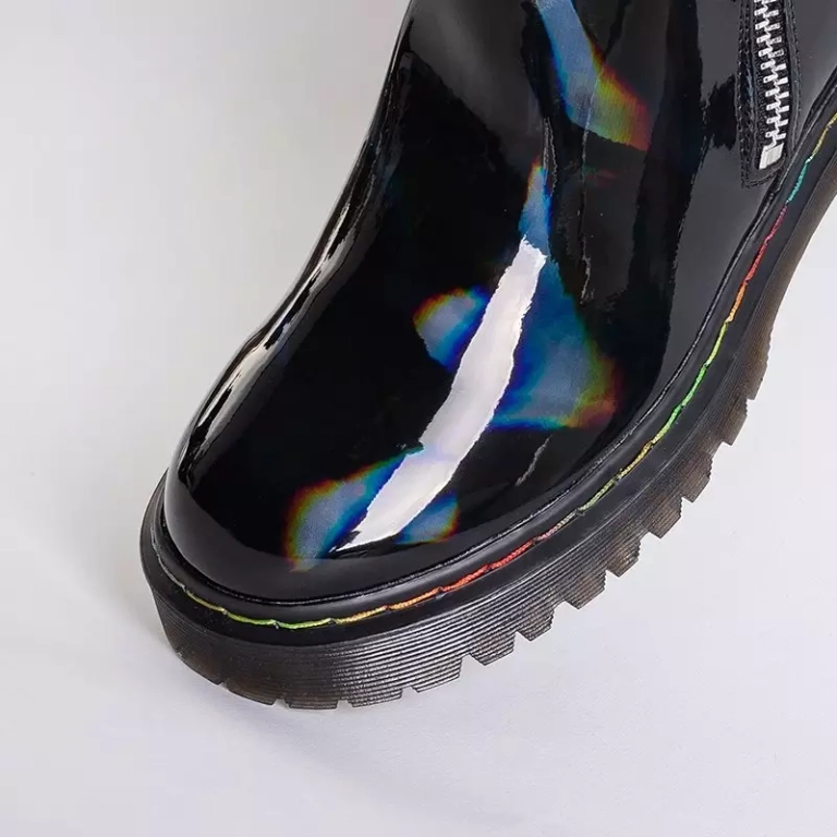 - Dámske čižmy z kombinácie gumeného materiálu a ekokože s holografickým motívom. Model bez zateplenia, vnútorná stielka je podšitá ekokožou. Výrezy na boku a zapínanie na zips. Poznámka: výrobok má zlomený materiál.