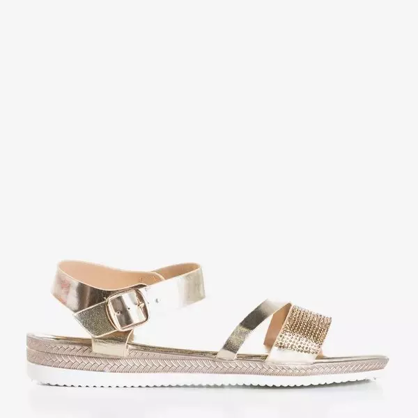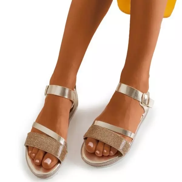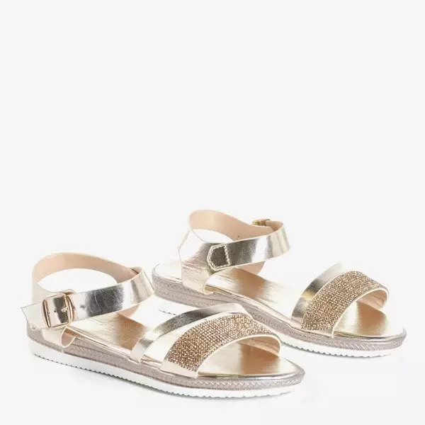 - Vkusné dámske sandále na rovnej podrážke zo zlatej ekokože. Topánky majú v prednej časti dvojitý remienok, jeden z nich je zdobený kubickými zirkónmi. Poznámka: výrobok má na materiáli stopy lepidla.