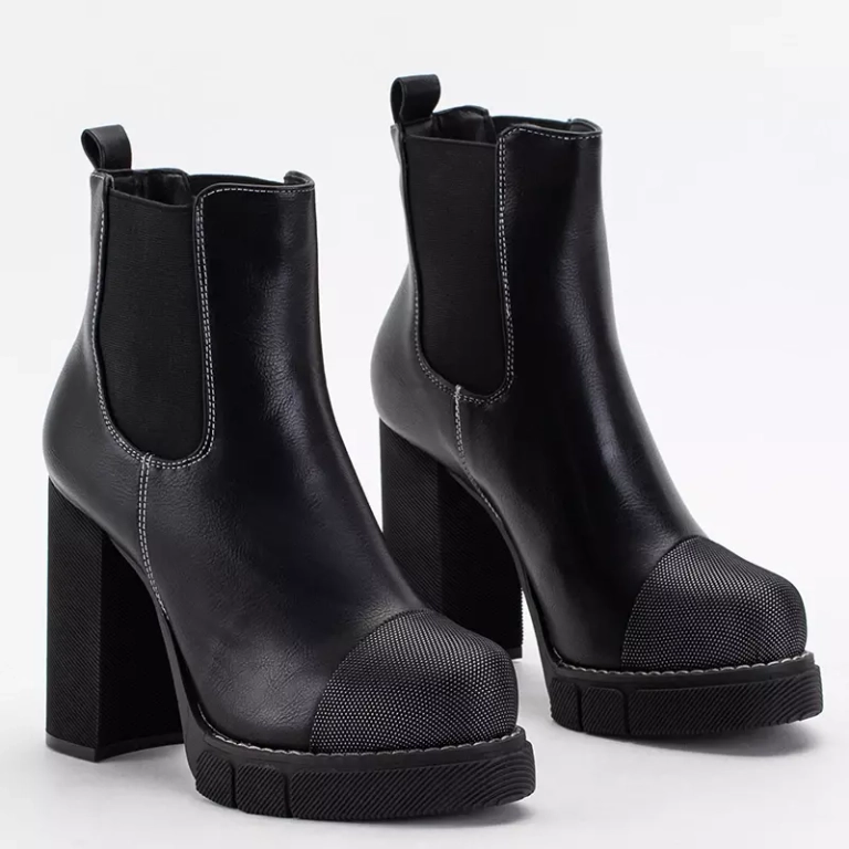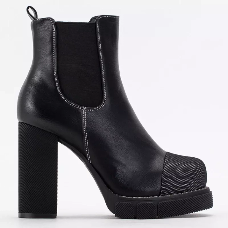 • Dámske čierne čižmy na vysokom stĺpiku, model vyrobený z ekokože. Špička zakončená látkou, stielka tiež látková, topánky bez zapínania. Poznámka: výrobok má na materiáli stopy lepidla.