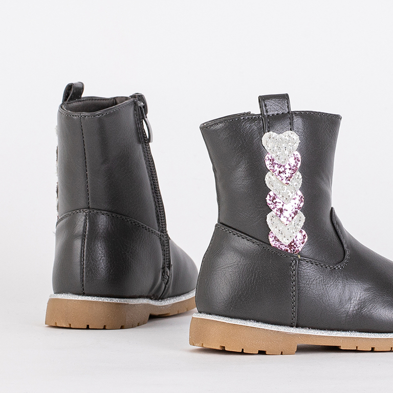 - Dievčenské čižmy vyrobené z ekologickej kože. Vnútro podšité tenkou penou a látkou, zapínanie na zips pri členku. Zdobené trblietavými srdiečkami! POZNÁMKA: Model môže mať v blízkosti podrážky stopy lepidla.