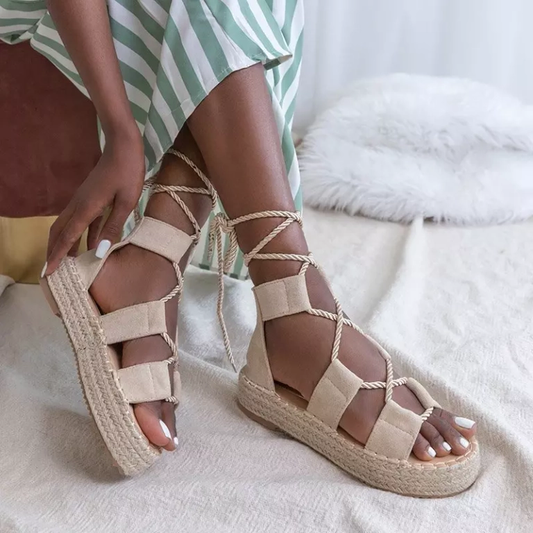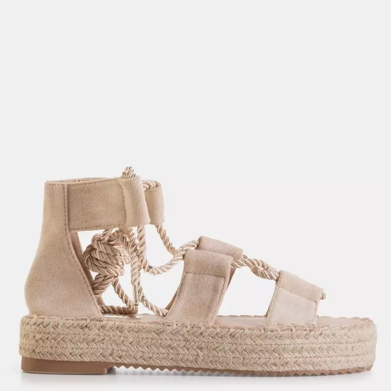 • Dámske béžové ploché sandále zdobené jutovou šnúrkou na podrážke. Model previazaný šnúrkou, vyrobený z ekologickej kamzíkovej kože. Veľmi ľahké a pohodlné!