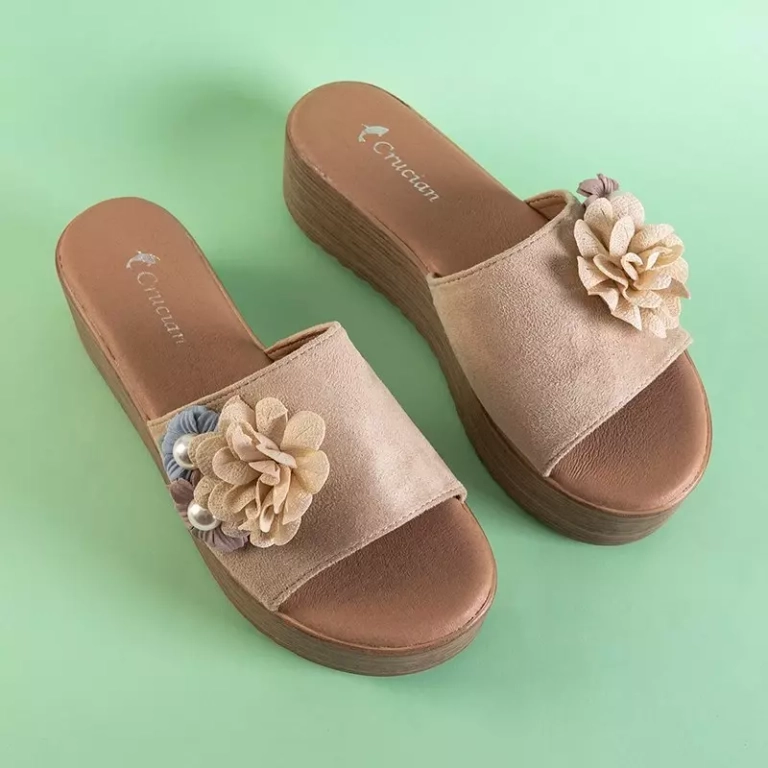 - Senzačné dámske papuče na platforme z materiálu imitujúceho drevo. Paseczek je semišová ekokoža, zdobená kvetmi. Stielka je potiahnutá ekologickou kožou. Poznámka: Produkt má zmenu farby na materiáli.