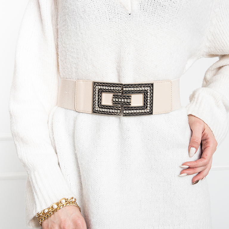 Dámsky béžový elastický opasok so striebornou prackou s kubickým zirkónom - Doplnky