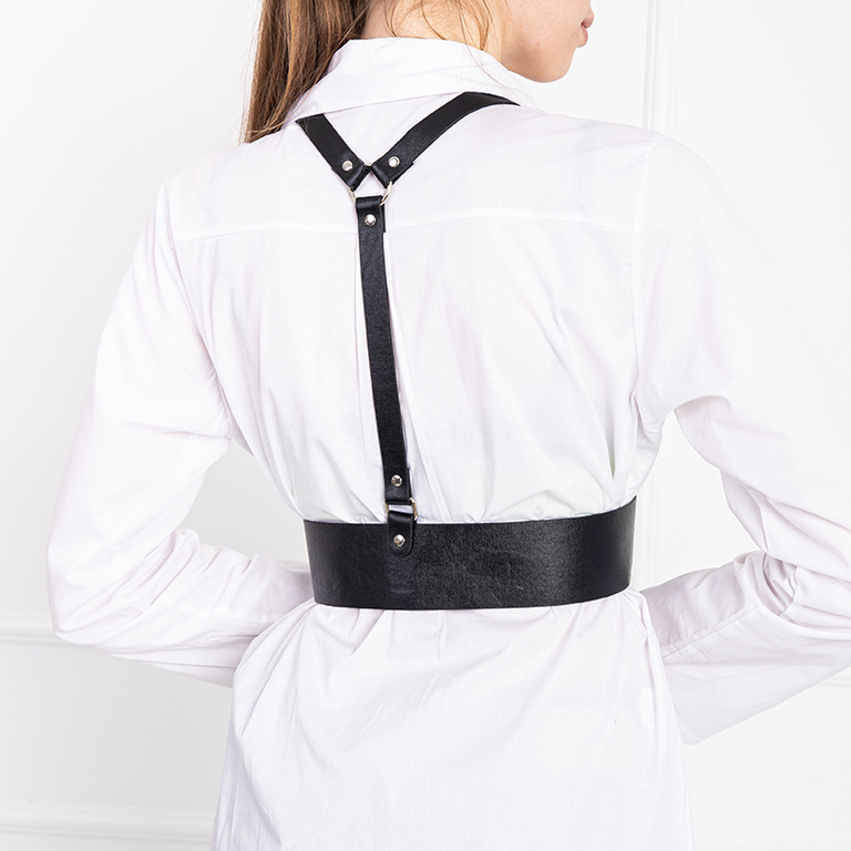 - Mega štýlový dámsky široký opasok s nastaviteľnými ramennými popruhmi. Model je vyrobený z ekologickej kože - dokonale zvýrazní ženské tvary. Skvelý doplnok k vašim ležérnym outfitom!