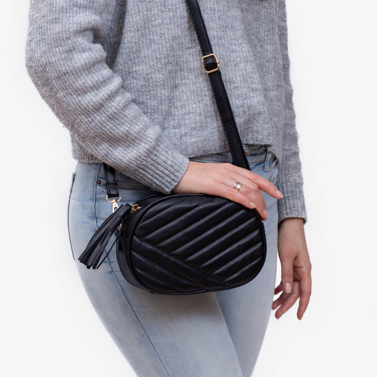 - Nadčasová malá taška cez rameno z ekologickej kože s prešívanou úpravou. Model je zdobený strapcom, vo vnútri má jedno vrecko na zips a jedno vrecko na zips. Navyše odnímateľný popruh s možnosťou nastavenia.