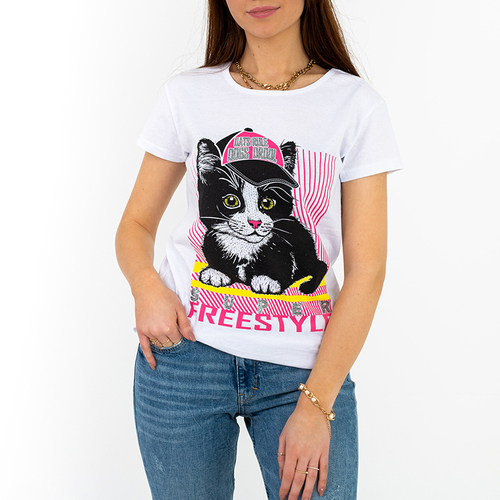 - Štýlové dámske tričko s krátkym rukávom a okrúhlym výstrihom. Prednú časť trička zdobí farebná potlač s mačiatkom a nápismi. Ideálny základ pre mnoho každodenných lookov! Presnosť merania (+/-) 1 cm.