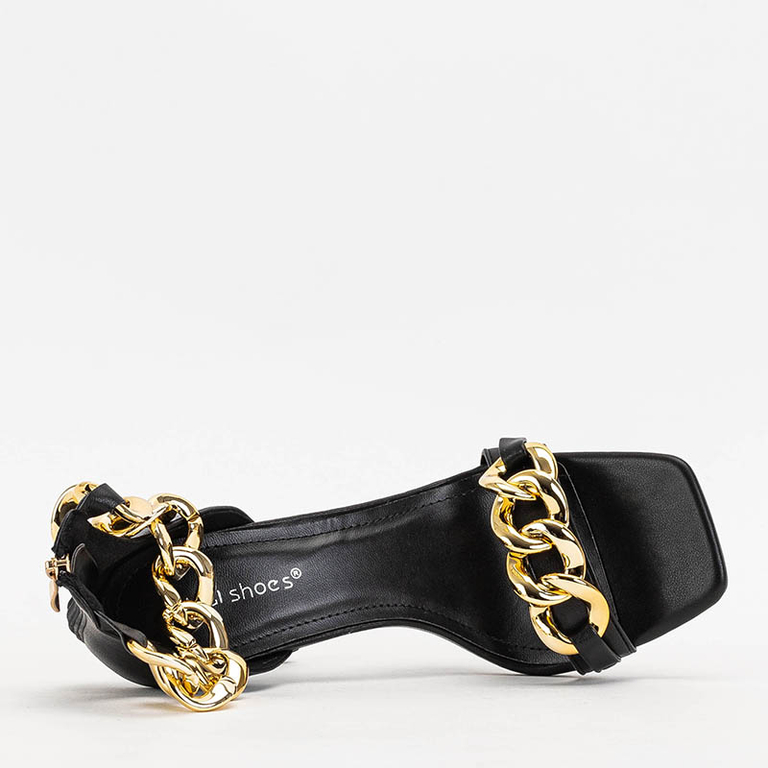 - Dámske sandále na vysokom podpätku, vyrobené z ekologickej semišovej kože. Vložka je vyrobená z eko kože. Model sa zo zadnej strany zapína na zips. Topánky zdobí zlatá retiazka na členku a na remienku na prstoch. Ideálne k večerným outfitom!