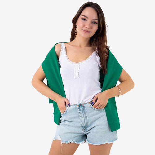 • Nadčasové dámske tričko s tenkými, čipkovanými ramienkami univerzálneho strihu, vyrobené z rebrovaného materiálu. bavlnená tkanina. Ideálne k šortkám a džínsom. POZNÁMKA: Presnosť merania (+/-) 1 cm.