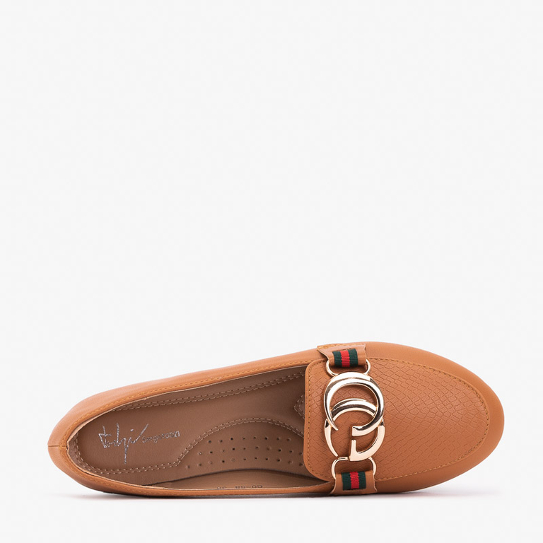 • Elegantné dámske mokasíny so zlatou kovovou ozdobou na špičke. Zvršok je vyrobený z ekokože, mäkká stielka s vankúšikmi je vyrobená z ekokože. Skvelý doplnok k vašim ležérnym outfitom!