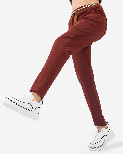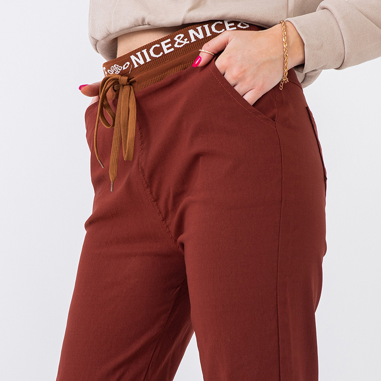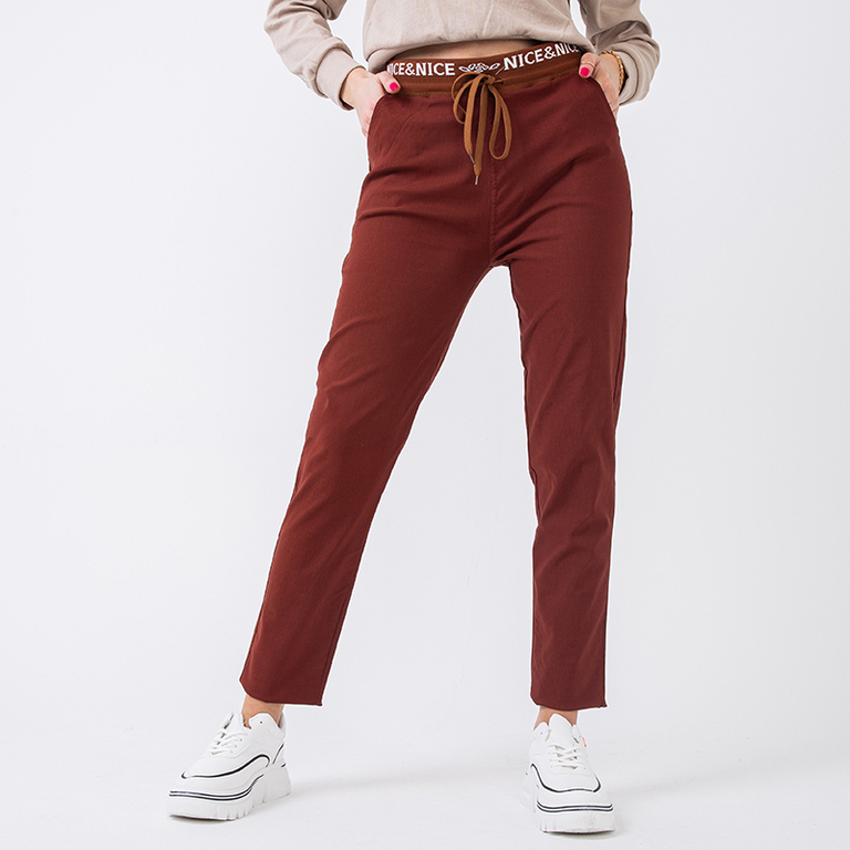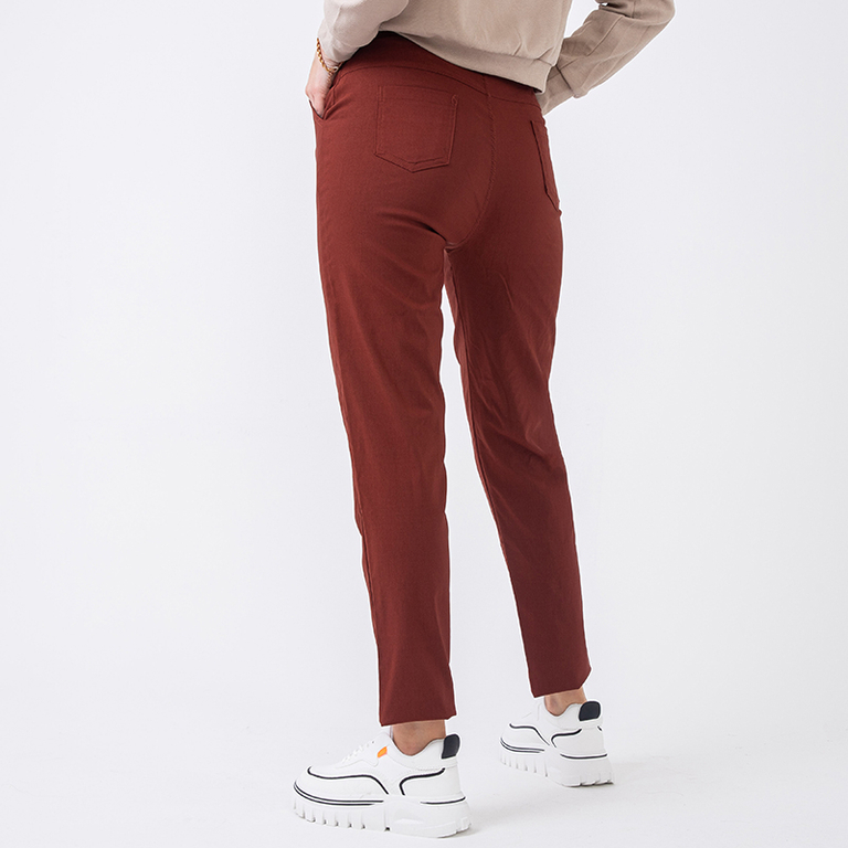 - Štýlové, látkové dámske nohavice s vysokým pásom, vyrobené z príjemnej bavlny. Model má elastický pás so zaväzovaním, 4 vrecká na zasúvanie. Nesmie chýbať v šatníku každej ženy! POZNÁMKA: Presnosť merania (+/-) 1 cm.