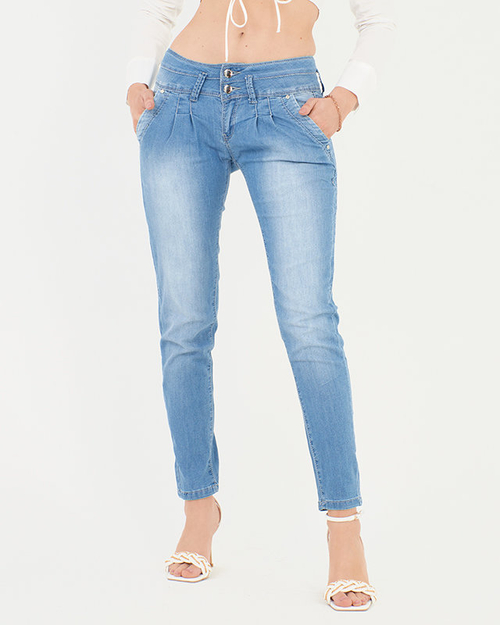 - Rovné dámske džínsy s elastickým pásom, zapínaním na zips a gombík. Na prednej strane majú 2 vsadené vrecká. POZNÁMKA: Presnosť merania (+/-) 1 cm.