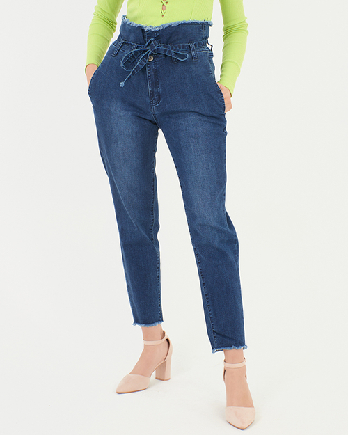 - Štýlové dámske mom jeans, vyrobené z bavlneného materiálu. Model má: - vysoký pás, - zapínanie na gombík a zips, - 4 vrecká, - opasok 100 cm dlhý a široký 2 cm POZOR: Rozmer presnosť (+/-) 1 cm.
