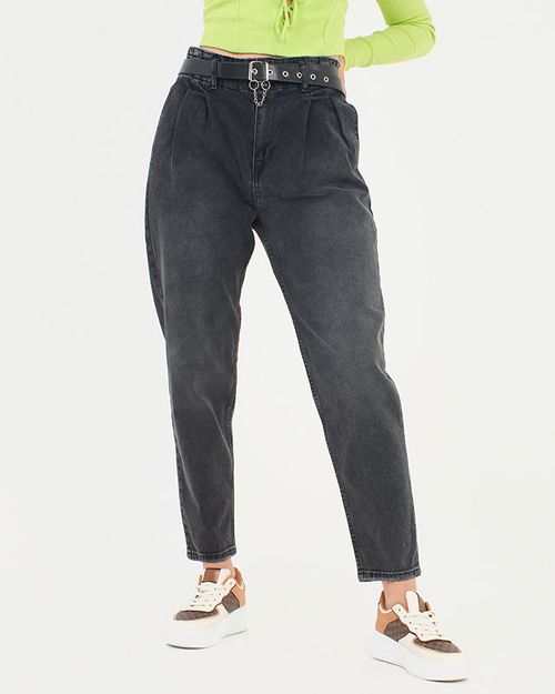 - Štýlové dámske mom rifle, vyrobené z bavlneného materiálu. Model má: - vysoký pás, - zapínanie na gombík a zips, - 4 vrecká, - opasok 100 cm dlhý a 3 cm široký POZNÁMKA: Presnosť merania (+/-) 1 cm.