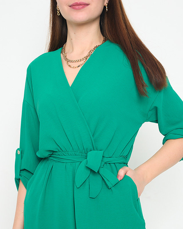 - Módny dámsky overal s dlhými rozšírenými rukávmi. Nohavice sú rovné a široké, výstrih je serpentínový s obálkovou prednou časťou. V páse je elastický pás a ozdobné viazanie. UPOZORNENIE: Presnosť merania (+/-) 1 cm.