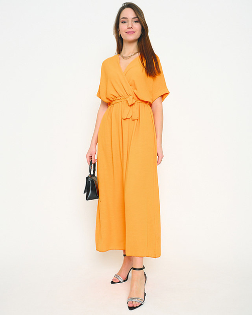 Oranžové dámske rovné šaty s obálkovým výstrihom - Oblečenie