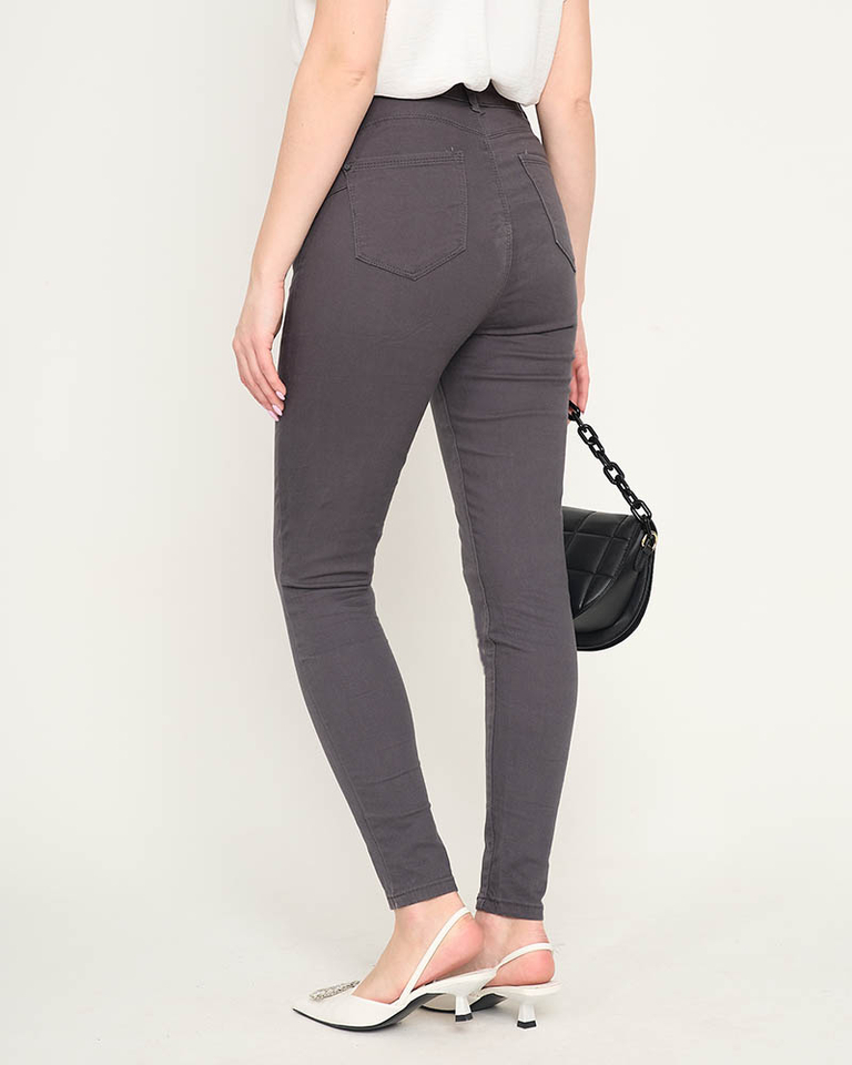 - Univerzálne úzke džínsy z bavlnenej látky. Model s vysokým pásom a gombíkmi. Dva páry vreciek na zadnej a prednej strane. POZNÁMKA: Presnosť merania (+/-) 1 cm.