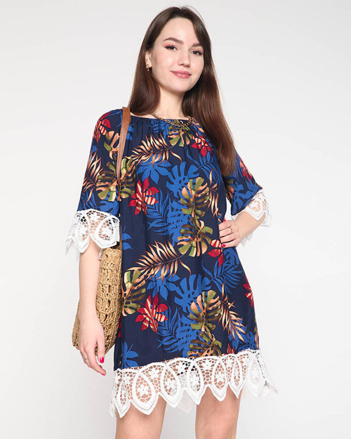 - Dámska tunika s krátkymi rukávmi z ľahkej látky. Model zdobí potlač lístkov, rukávy a spodná časť tuniky zakončená čipkou. Skvelá voľba na horúce dni! POZNÁMKA: Presnosť merania (+/-) 1 cm.