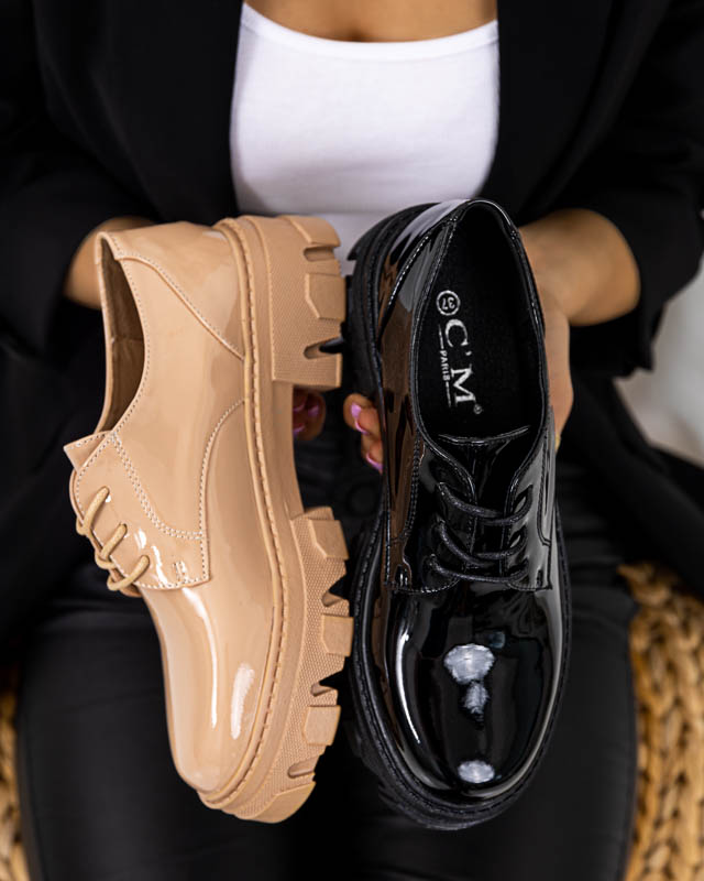 • Módne dámske topánky s hrubou podrážkou, vyrobené z ekologickej lakovanej kože. Vnútro topánok je podšité ekologickou kožou. Model na šnurovanie. Perfektná každodenná obuv pre mnoho štýlov!