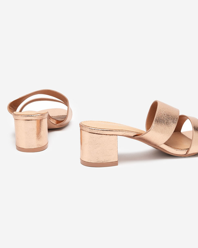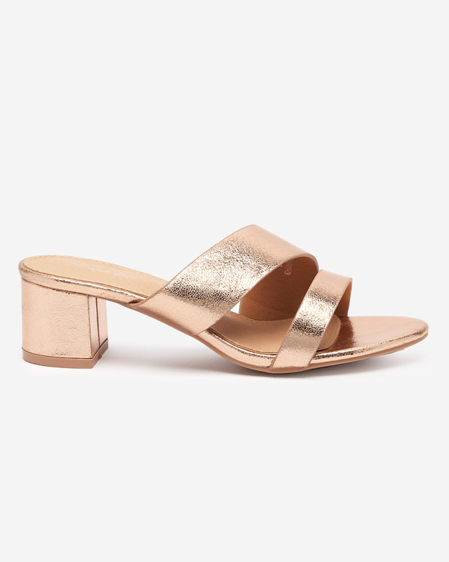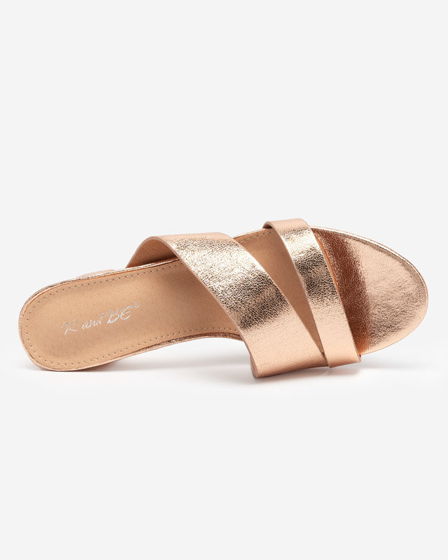 - Krásne dámske sandále vyrobené z ekologickej kože. Model v krásnej zlato-ružovej farbe. Papuče majú nízky opätok. Originálna obuv, ktorá sadne mnohým štýlom!