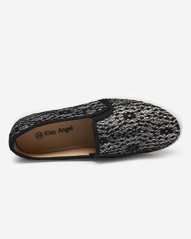 • Dámske slip-on topánky vyrobené z látky. Model je zdobený lesklými flitrami a čiernou čipkou. Pohodlie im dodáva gumená podrážka. Perfektná obuv na každý deň!