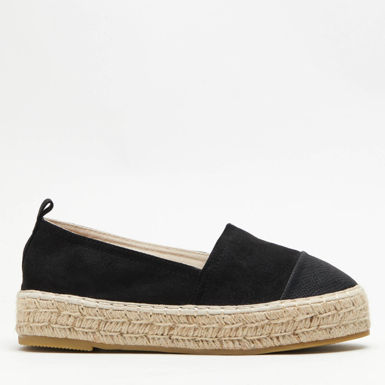 - Úžasné espadrilky v čiernej farbe, vyrobené z ekologického semišu. Špička je zdobená ekologickou kožou s reliéfom zvieratiek. Podošva je pokrytá pletenou jutovou šnúrou. Poznámka: Produkt má na materiáli nečistoty.