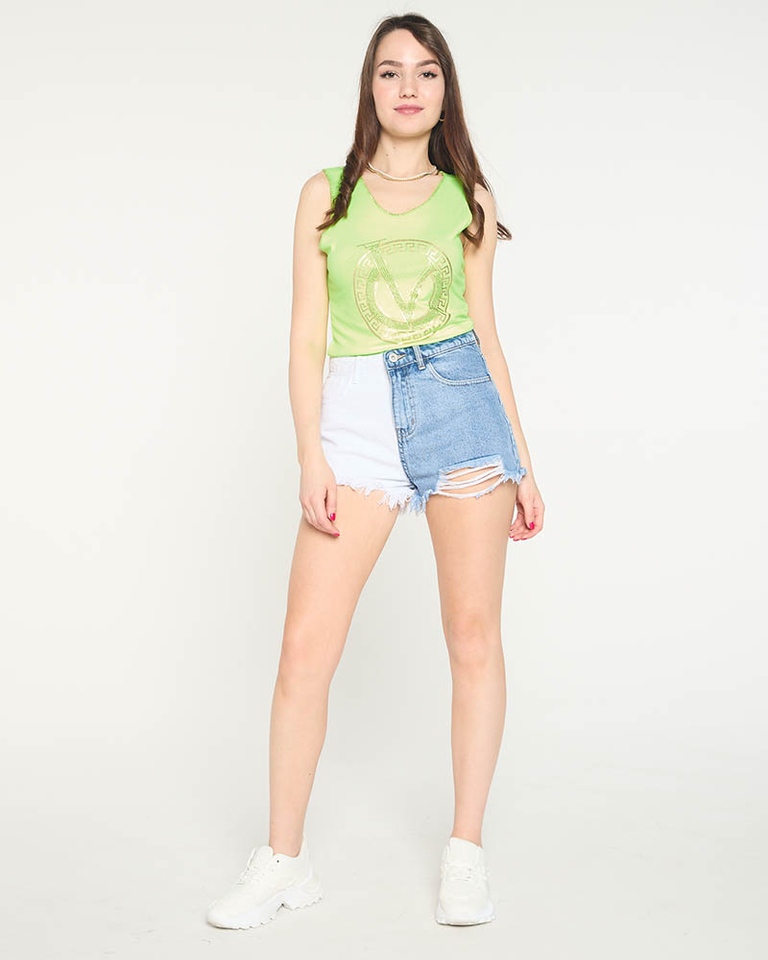- Dámsky top s ramienkami z elastického materiálu. Zlatá potlač na prednej strane. POZNÁMKA: Presnosť merania (+/-) 1 cm.
