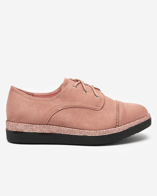 • Pohodlné dámske topánky so šnurovaným zvrškom z ekologického nubuku. V strede mäkká stielka z ekokože. Podrážka má trblietavý opasok a ozdobné kamienky na špičke. Poznámka: výrobok má na materiáli stopy lepidla.