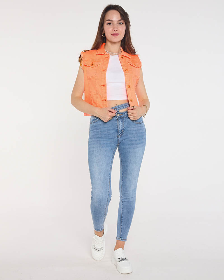 - Džínsová vesta bez rukávov v zaujímavom odtieni. Zapínanie modelu na kovové gombíky, golier a dve vrecká s chlopňou na prednej strane. POZNÁMKA: Presnosť merania (+/-) 1 cm.