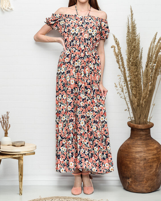 Dlhé tmavomodré dámske šaty s koralovými kvetmi - Oblečenie