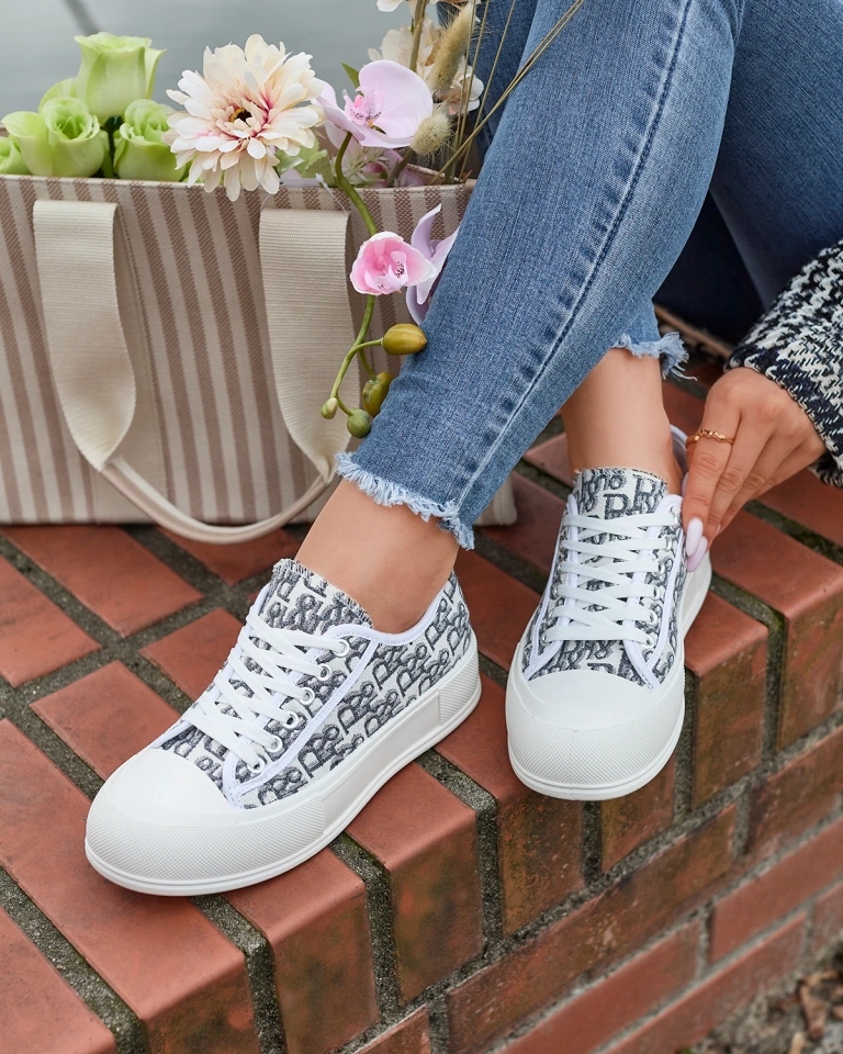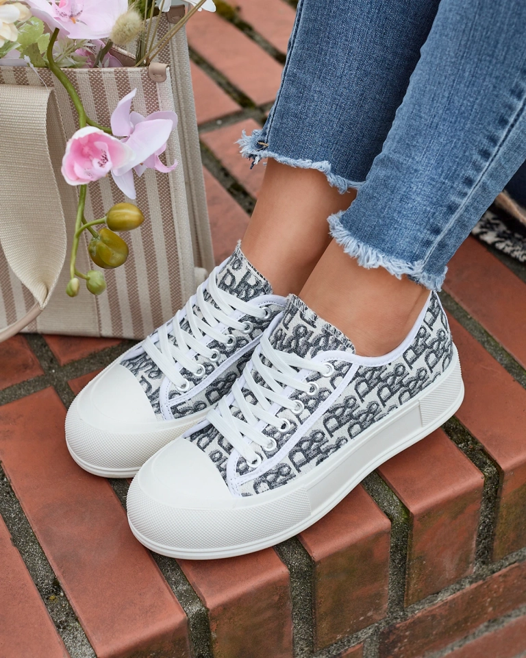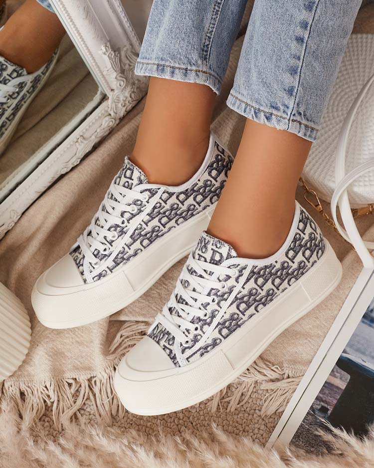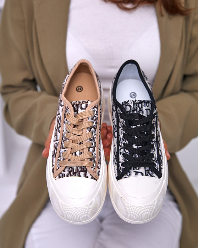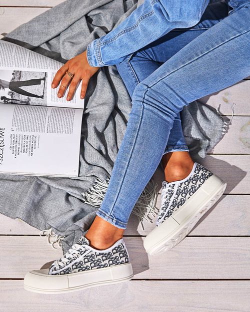 • Krásne dámske tenisky z látky s módnym vzorom. Model sa zaväzuje na šnúrky a má látkovú stielku. Ideálny základ pre mnohé každodenné outfity! UPOZORNENIE: model môže mať jemné škrabance na priehlavku.