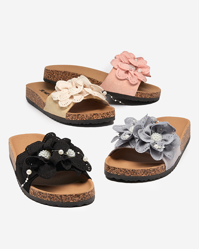 - Očarujúce dámske papuče z ekologickej semišovej kože, zdobené látkovými kvetmi s perličkami. Podrážka je zdobená materiálom typu korok. Skvelý doplnok k mnohým letným štýlom! Poznámka: výrobok má na materiáli stopy lepidla.