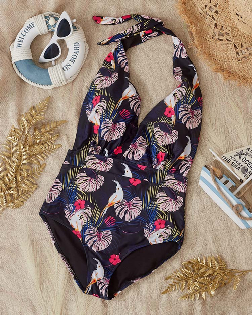 - Jednodielne dámske plavky s exotickým rastlinným vzorom, vypchatými košíčkami a zaväzovaním okolo krku. POZNÁMKA: Presnosť merania (+/-) 1 cm.