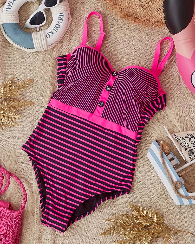• Fantastické dámske pásikavé plavky, zdobené gombíkmi. Model s vystuženými košíčkami a push-up, zaväzovaním vzadu a nastaviteľnými ramienkami. Na dovolenke musím byť v tvojom kufri! POZNÁMKA: Presnosť merania (+/-) 1 cm.